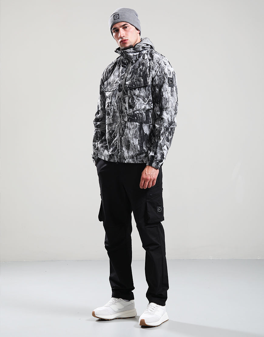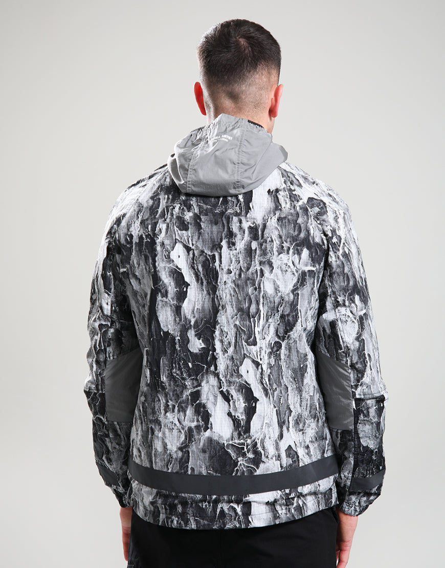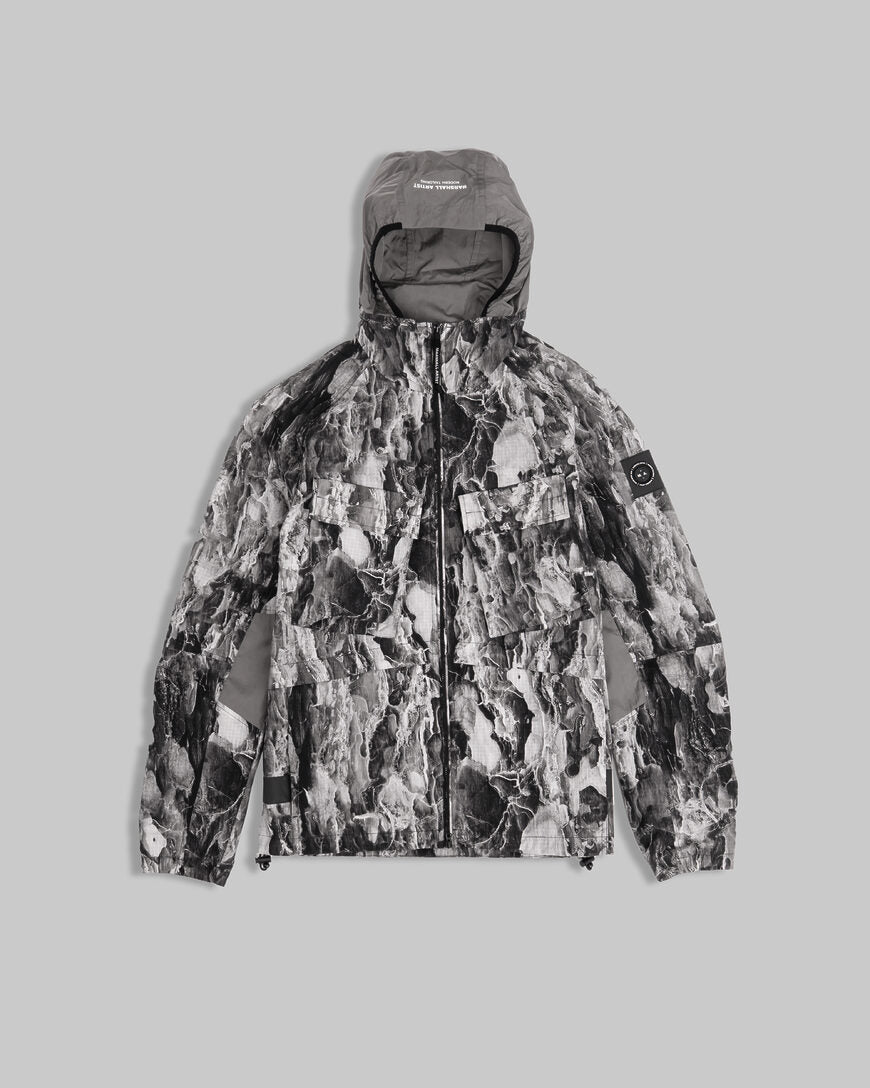 This jacket is constructed from a lightweight semi-translucent nylon ripstop shell with woodland camo overprint. Features contrast krinkle nylon hood, internal collar and panelling to the sleeve. Two large velcro fastening bellow pockets to chest, two snap closure side entry pockets and hidden welt pockets. Elasticated cuffs and adjustable bungee hem. Finished with tonal black reflective MA print and tonal black reflective tape print runs across back hem into side pockets. Siren badge to the left sleeve. Regular fit.